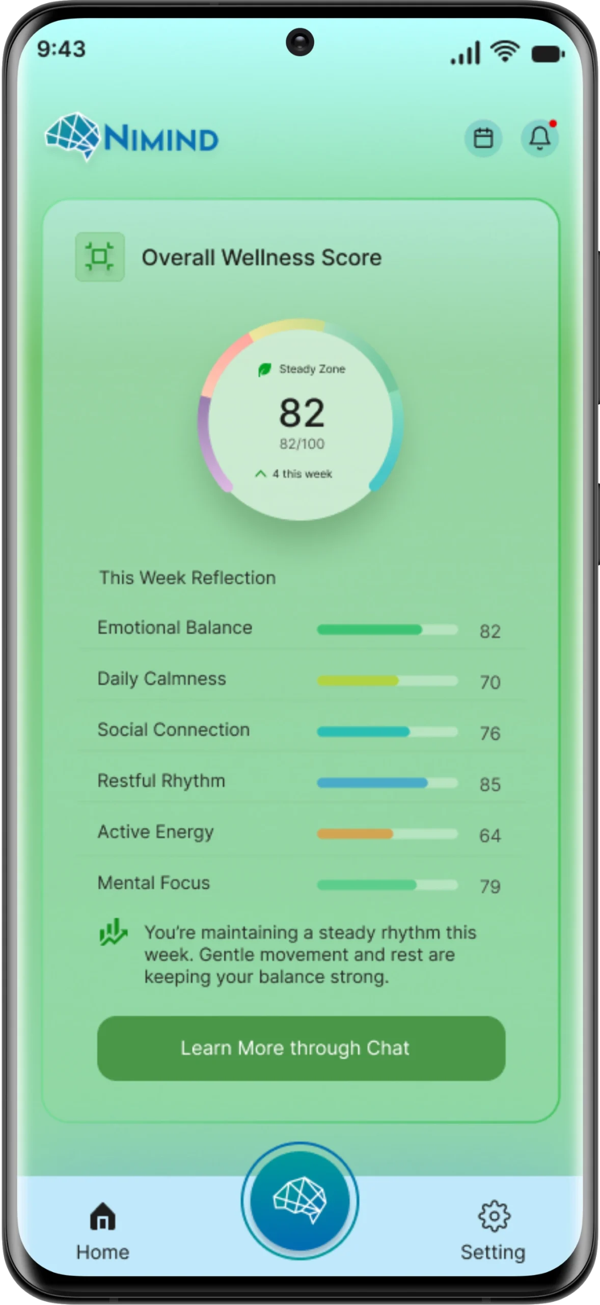 NiMind is your AI Companion for mental wellness. It supports you through personalized conversations and insights based on your overall wellness patterns—like sleep, screen time, and mood.