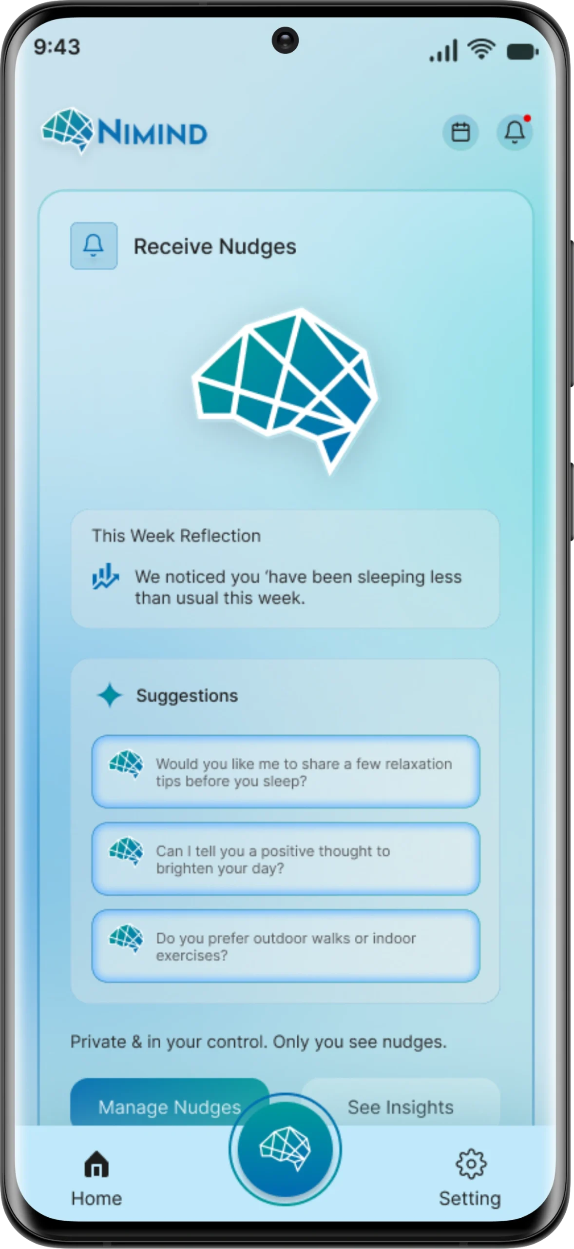 With your consent, NiMind picks up on subtle patterns like screen time, movement and sleep habits.