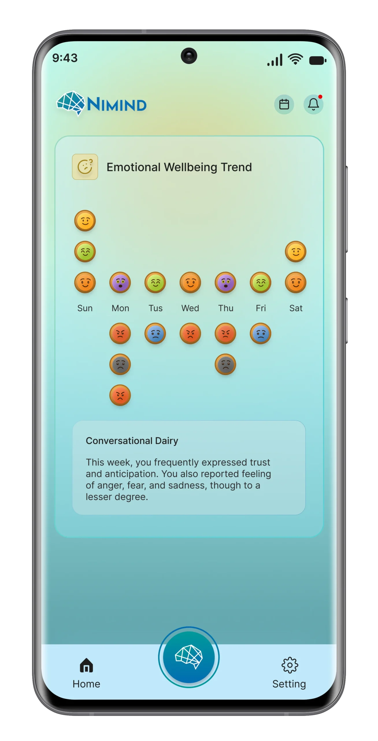 NiMind helps you stay emotionally balanced with AI-powered mental wellness tracking—effortless, private, and personalized.