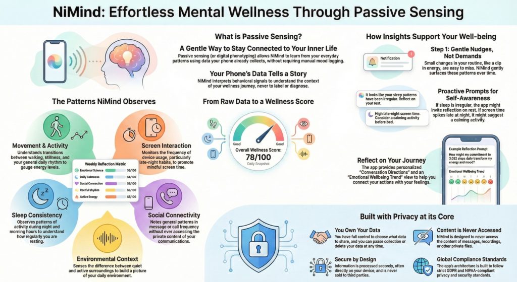 How does NiMind use passive sensing for wellness? NiMind utilizes continuous monitoring via Android and iOS APIs (such as Google Fit and HealthKit) to create a “temporal map” of user behavior. By observing subtle changes in screen engagement, movement consistency, and environmental cues, the platform provides personalized, gentle nudges to support proactive self-care.