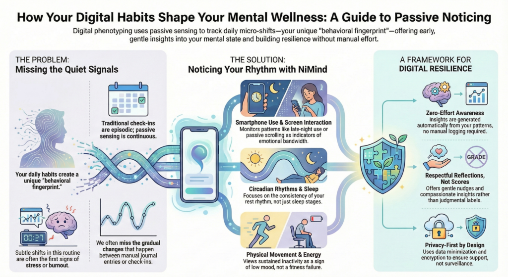What is digital phenotyping in mental health? Digital phenotyping is the moment-by-moment quantification of an individual’s behavioral patterns such as sleep rhythms, physical movement, and smartphone interaction using passive sensor data from everyday devices. NiMind uses these digital biomarkers to identify early shifts in wellness without requiring manual user input.