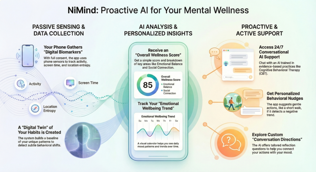 While the app monitors these subtle “digital biomarkers,” it also provides an empathetic AI companion. Trained in evidence-based practices like Cognitive Behavioral Therapy (CBT) and mindfulness, NiMind feels less like an app and more like a thoughtful friend who is always ready to listen without judgment.