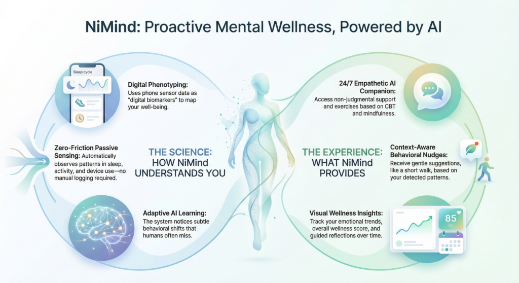 Experience NiMind, the zero-friction wellness companion. Using secure passive data sensing and empathetic AI, NiMind identifies early behavioral shifts to provide proactive mental health support—privately and intelligently.